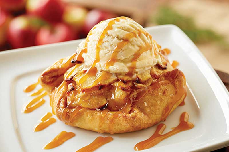 Corteza de hojaldre caliente con relleno servido con helado de vainilla. Relleno de manzana con un toque de canela.