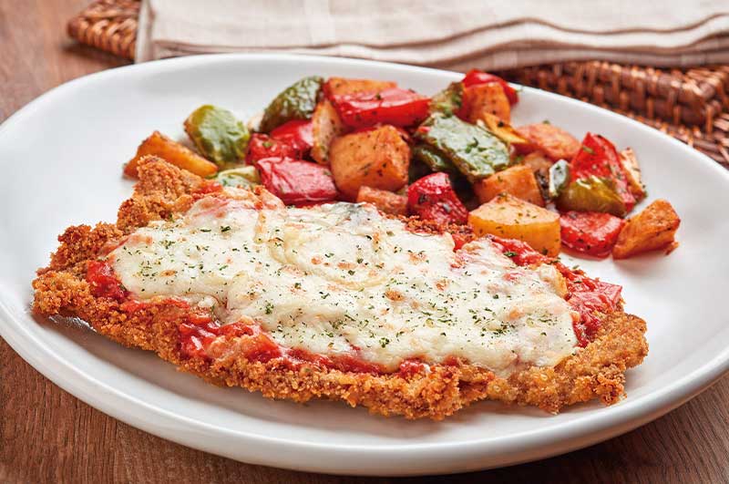 Carne de res empanizada (113 gr) cubierta de salsa marinara y queso mozzarella gratinado, acompañada de papa toscana.